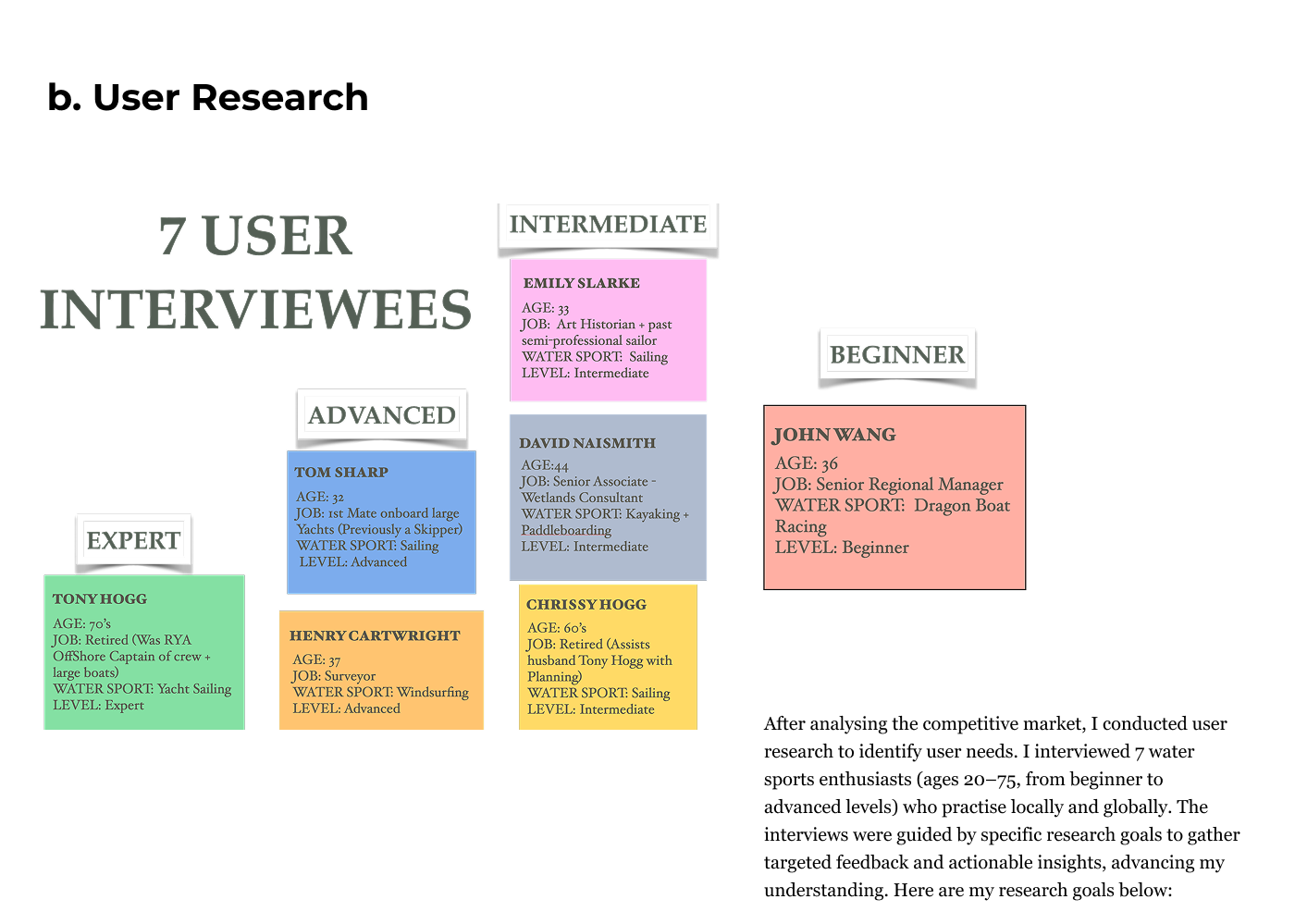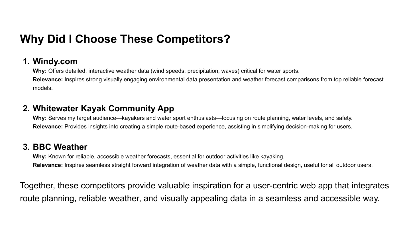 To gain a deeper understanding of the problem, I conducted extensive research into weather conditions, water safety, and user habits. I performed a Competitor Analysis to identify market gaps and carried out User Research to uncover key user needs and pain points; interviewing water sports enthusiasts across all skill levels (beginner to advanced).