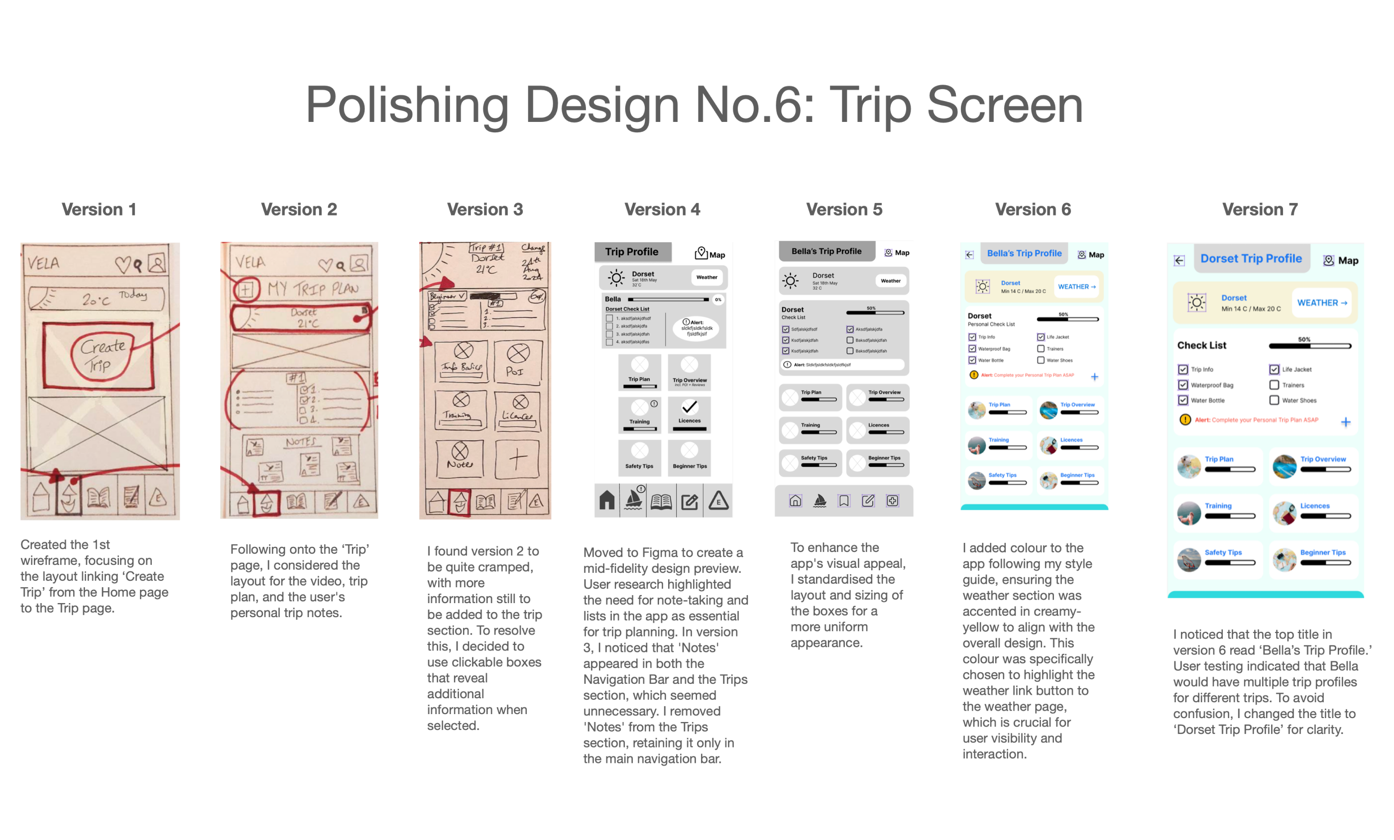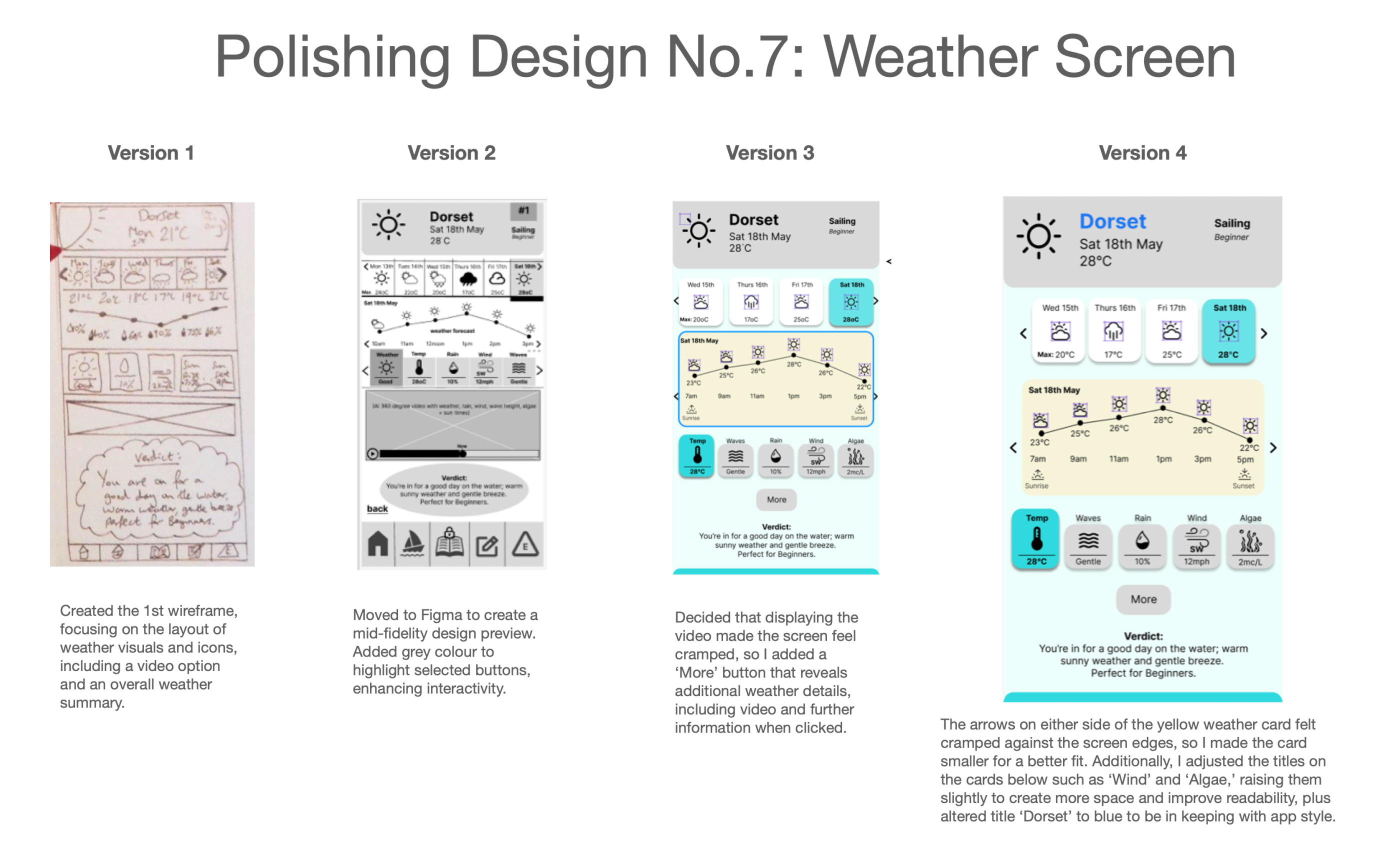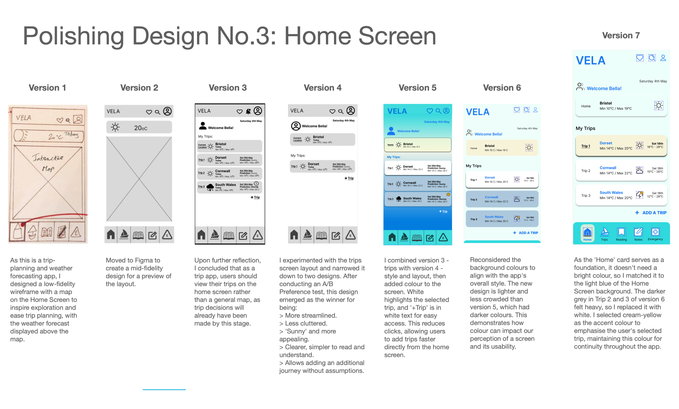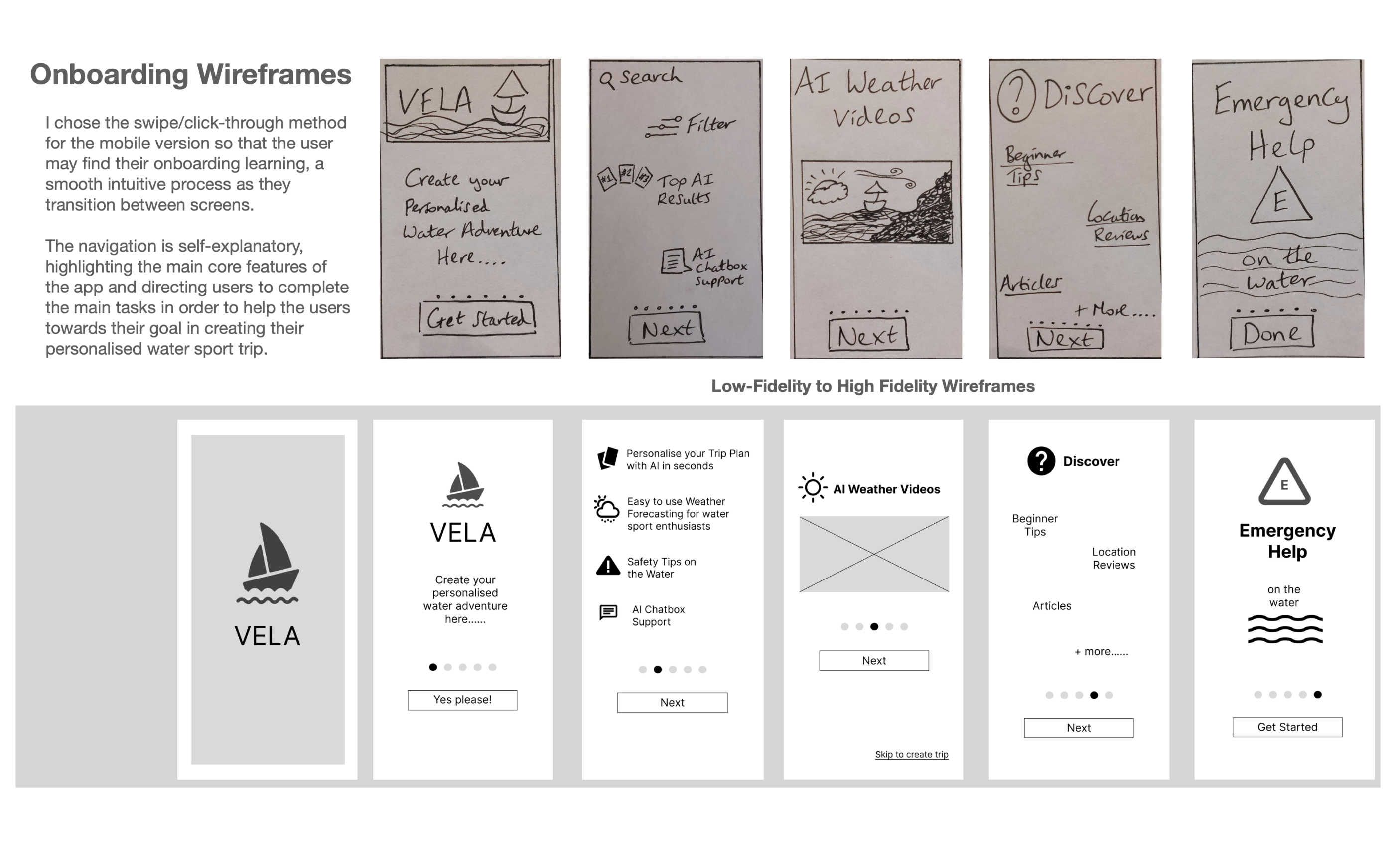 The design process evolved from low-fidelity hand-drawn wireframes to high-fidelity versions, with refinements made at each stage based on user research. Key changes made to the app include:
