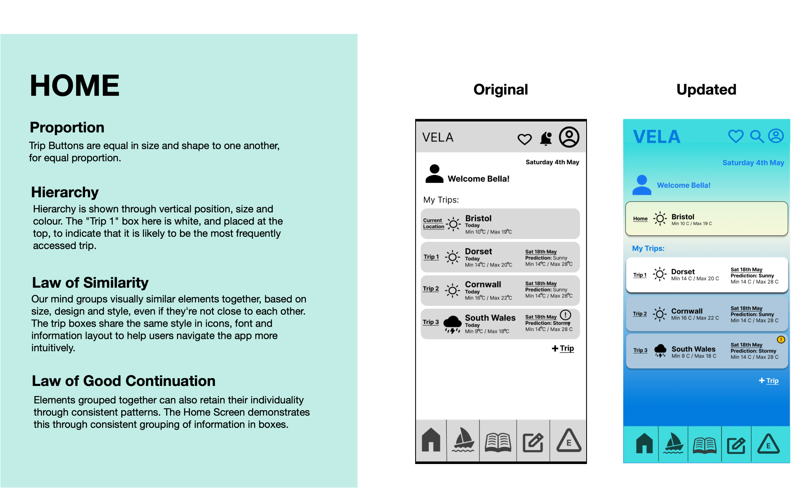 Through iterative testing and feedback, I refined the designs, applying Gestalt principles for clear visual hierarchy and improved functionality. Peer reviews led to additional adjustments, such as: