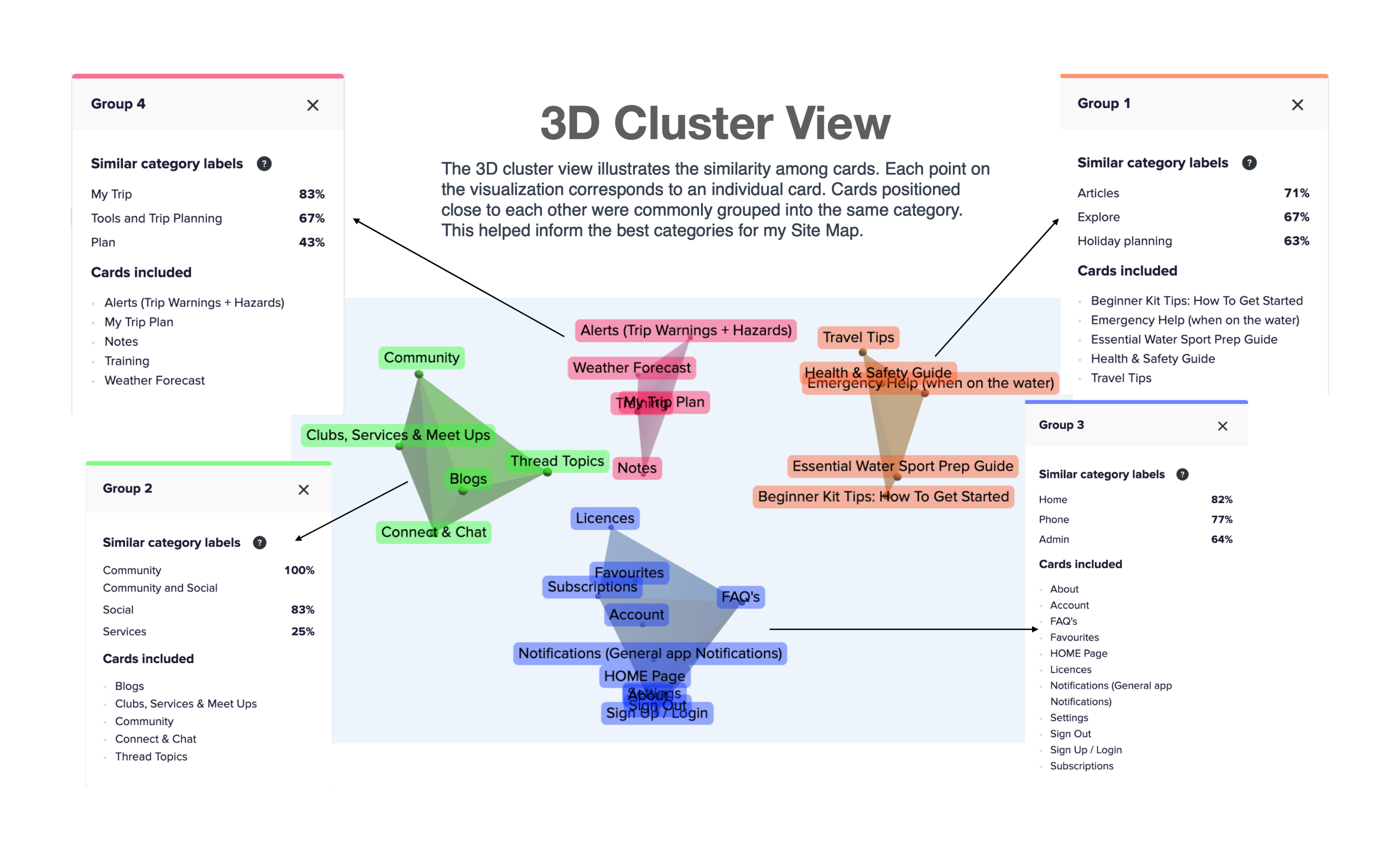 I analysed user research using affinity mapping to identify behaviours, pain points, and goals. I then created pie charts to visualise the percentages of these elements, providing deeper insights into user needs and pain points.